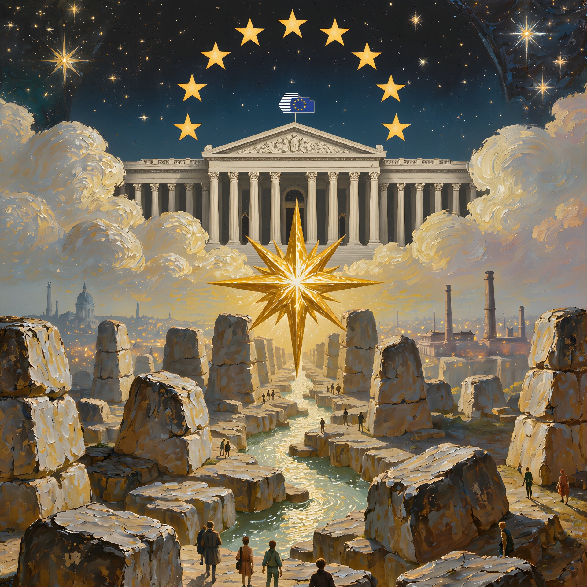 A luminous river of light flows organically across the stones, forming a unifying path that connects the fragmented architecture into a coherent whole. Realistically rendered, diverse contemporary Europeans move along this glowing path, symbolizing innovation, mobility, and shared progress.