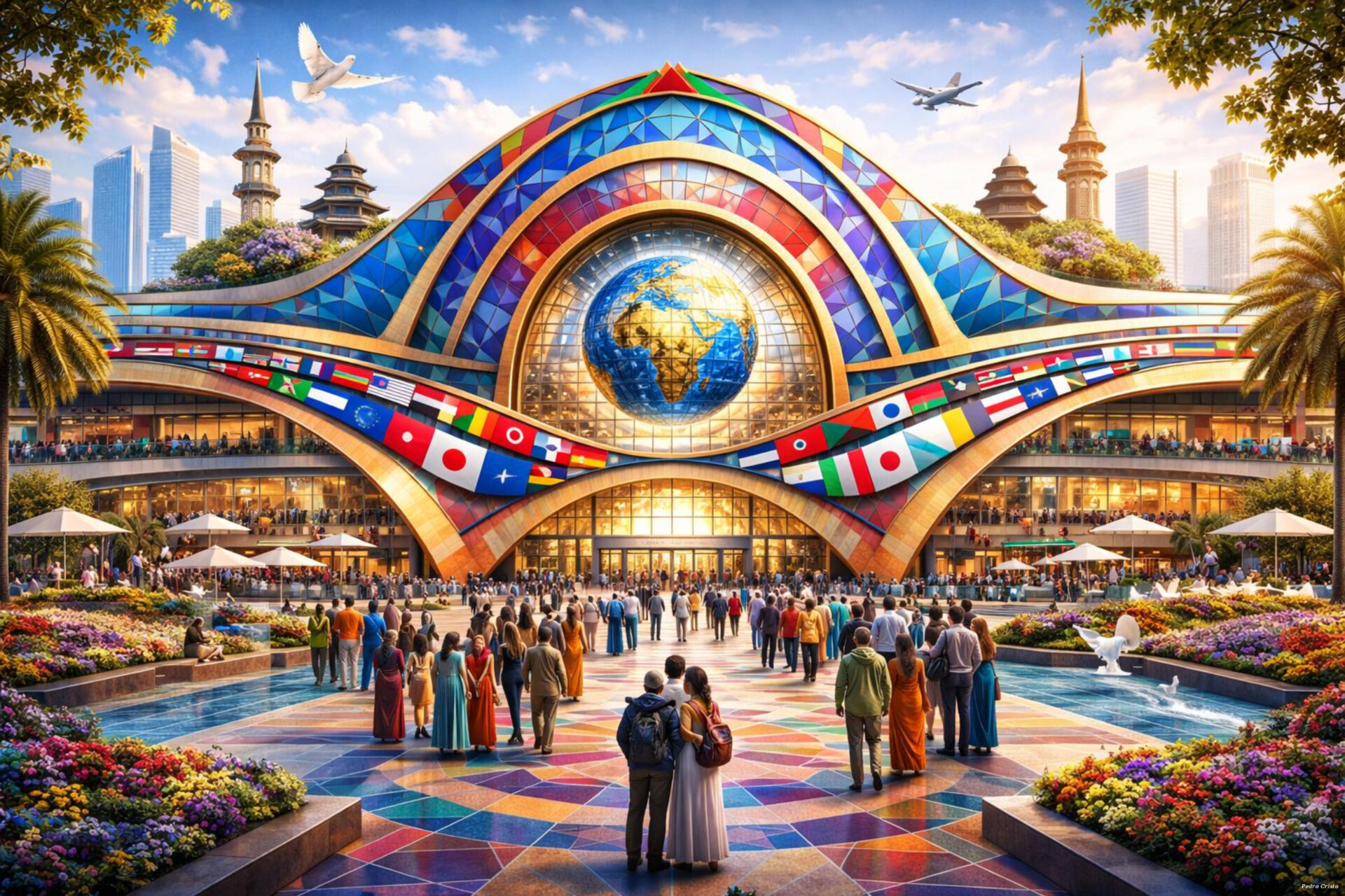 "Union, travel, and peace expressed through symmetrical geometric forms, creating a modern space where cultures connect as one. The composition transforms abstraction into a shared environment, where lines, shapes, and